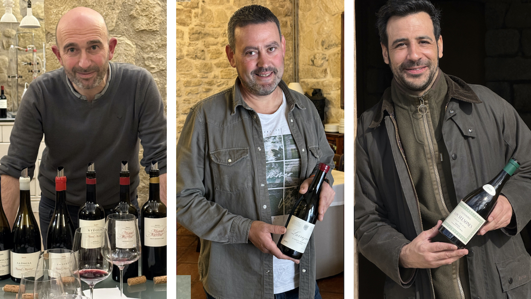 Productores de vino que renuevan los estilos de Rioja, con viñedos viejos tanto en Briones como los publeos de la Sonsierra, Labastida y Peciña en San Vicente de la Sonsierra. De izquierda a derecha: Miguel Merino (Miguel Merino), Alberto Martínez (viñedos Larrazuri, Cosecheros de Labastida), y Eduardo Eguren (Cuentaviñas).