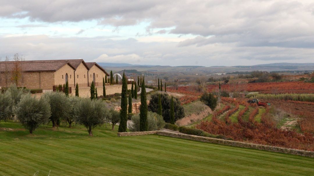 La Bodega Marqués de Murrieta fue restaurada con el estilo original en 2014. El trabajo artesano en piedra para las paredes y las cabreadas de madera para los techos es buena parte del atractivo. Al final de la foto, sobre la izquierda, se ve el Ebro.
