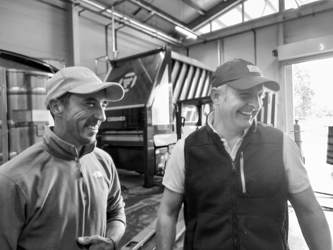 Charlie Holland is not alone in seeing that this part of England offers completely different possibilities. There certainly is momentum in Essex. Wine GB advised that plantings in Essex grew from 93 hectares in 2010 to 493 hectares in 2024, more than a five-fold increase. Under the auspices of London wine merchant Flint Wines and its co-founder Jason Haynes, two Burgundian winemakers arrived in October 2025 to make wine from Essex fruit: Alex Moreau of Chassagne-Montrachet made his first English Chardonnay from fruit grown at Missing Gate vineyard, while Pierre Duroché from Gevrey-Chambertin made his first English Pinot Noir from fruit grown at Danbury Ridge. Their presence has caused quite a stir. This partnership project had been in the pipeline for a while. It could not be realized in 2024, as the Burgundians hardly dared to leave their vineyards in that challenging vintage. It all feels like it was meant to be, since those two adventurous vignerons were able to make their maiden English vintages with sensationally healthy fruit from 2025. We will have to wait to taste their wines, but their presence bodes well for Essex and English still wine as a whole. Both Moreau and Duroché were all smiles as they picked their fruit in early October.