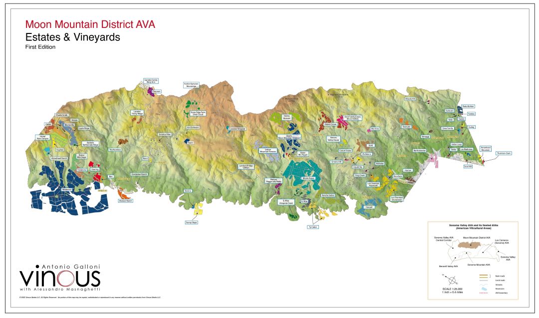 Later, I had the opportunity to taste many Martini wines from the 1950s and 1960s that told the story of a remarkable place. First planted in 1882, Monte Rosso is one of the most iconic vineyards in the United States. Nearby Moon Mountain Vineyard, established around the same time, is another example of the rich legacy that lies within these rugged hills. Eventually that interest led to a map of the AVA that we created with Alessandro Masnaghetti as part of a full set of Sonoma Valley maps we published in 2021. Portions of this text are taken from that map.