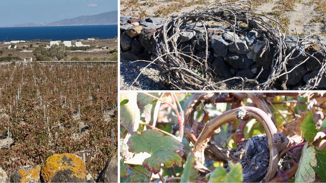 The past three vintages—2023, 2024 and 2025—have pushed Santorini’s vineyards to their limits, deepening an already fragile supply situation. The 2023 season started with just 180 millimetres of winter rainfall, well below the island’s modest average of 330 to 350 millimetres. In April, a rare and destructive hailstorm struck most vineyard zones, cutting yields by around half and damaging buds that would have produced the following year’s canes. Already weakened by heat and drought, many vines struggled to recover. Two thousand twenty-four brought even less rain—only 100 millimetres—leading to severe water stress, limited growth and one of the earliest harvests on record.