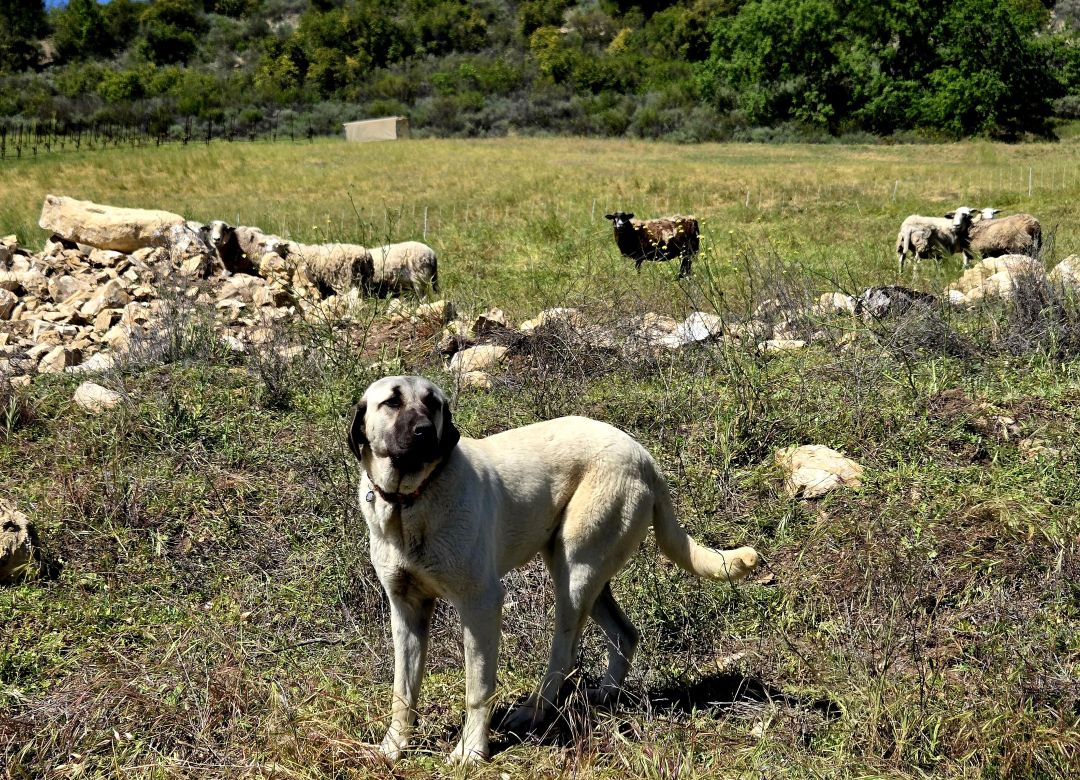 Kaia, the Turkish Boz Shepherd, guarding the herd in the regenerative MAHA Estate vineyards.