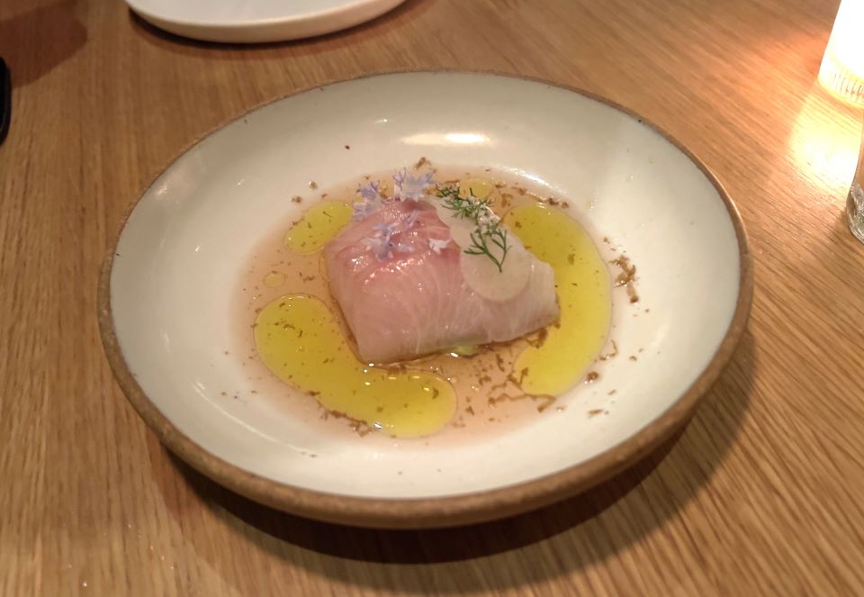 Yellowtail Crudo; Sauce Maritimo, Avocado Purée, Pickled Turnip, Ilene’s Olive Oil, Cilantro Flower