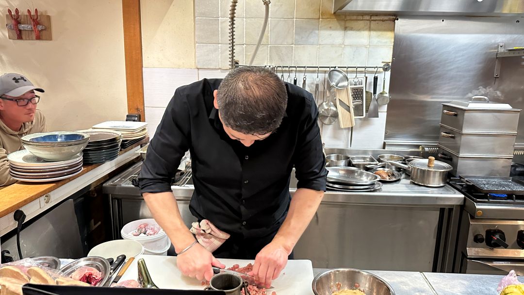 Chef Hirobe in his natural pose: head down, focused on assembling the dish.