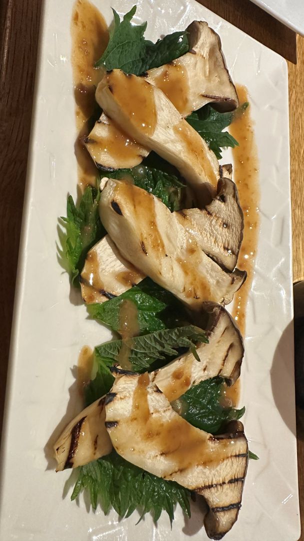Every meal begins with a bowl of fresh edamame as good as you will find anywhere in Japan. Pop those beans from out of their “sleeping bags” whilst Chef preps your first dishes. Another regular is a rectangular plate of eryngii, aka King Oyster mushrooms, which live up to their royal name. These are thinly sliced and eaten raw to retain flavour and earthiness, served with shiso leaves that complement the fungi (too many people leave the shiso aside) and drizzled with a sweet soy sauce. Divine.