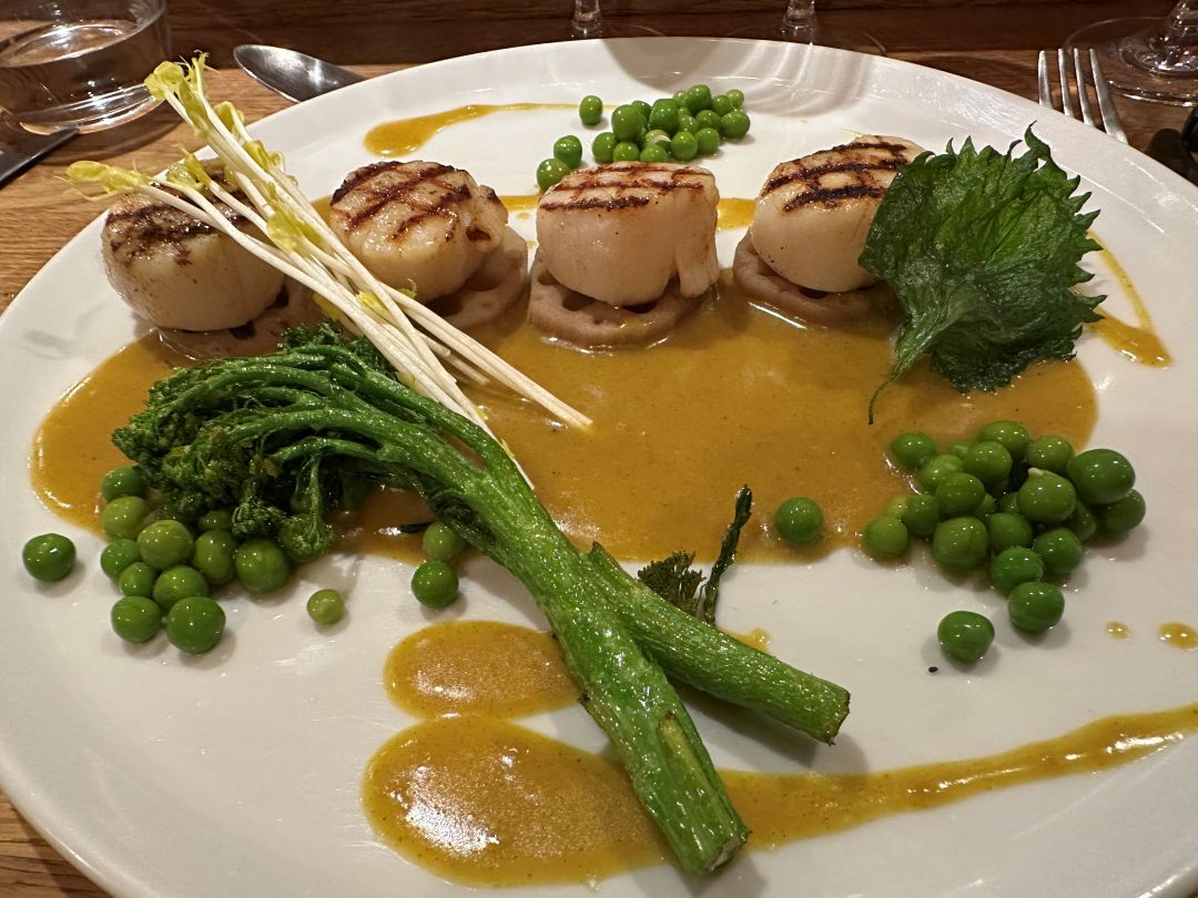 Grilled scallops with petits pois, lotus root and shellfish curry.