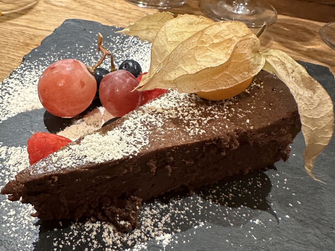 I always leave room for the gâteau de chocolat that comes with raspberry, redcurrant or yellow plum. It has the perfect consistency so that it sticks to the fork, and the acidity prevents any cloyingness or heaviness. It is a simple but masterful take on the classic French dessert.