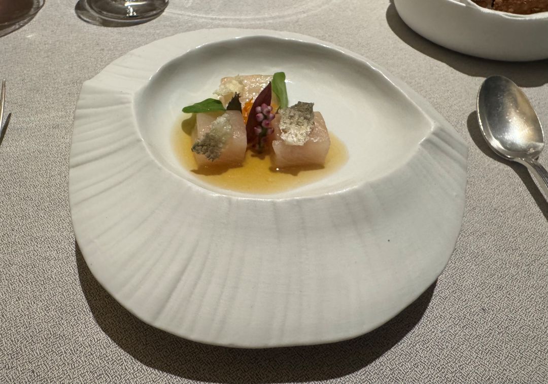 Marinated Amberjack; Seasonal Vegetables and Flowers, Rice Vinegar Extraction.