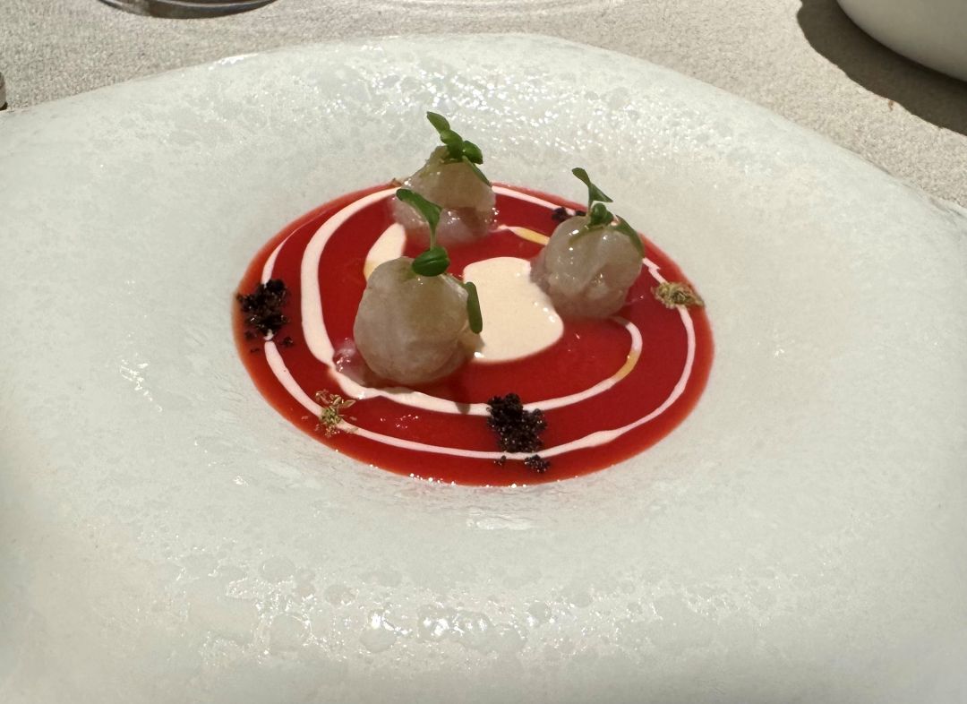 Raw scampi is a signature Cannavacciuolo dish. Sweet scampi are served over a tomato velouté inspired by the tomato conservas Cannavacciuolo grew up with as a child in Campania. The dish is finished with a rich octopus water emulsion, a sort of mayonnaise made from the liquid that is left after cooking octopus. Southern influences abound.