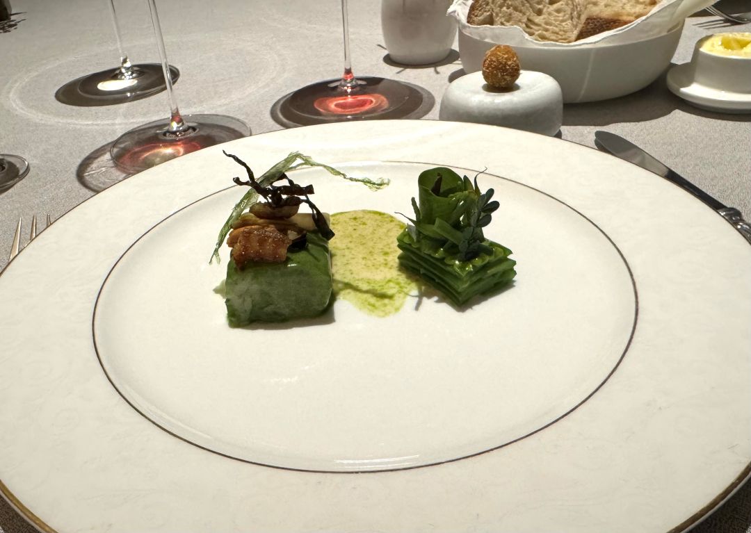 Rombo, Orto e Conchiglia; Millefoglie di Taccole all Monachina, Latticello e Olio di Rucola (Turbot, Garden and Shellfish; Snow Pea Millefeuille, Buttermilk, Arugula Oil)