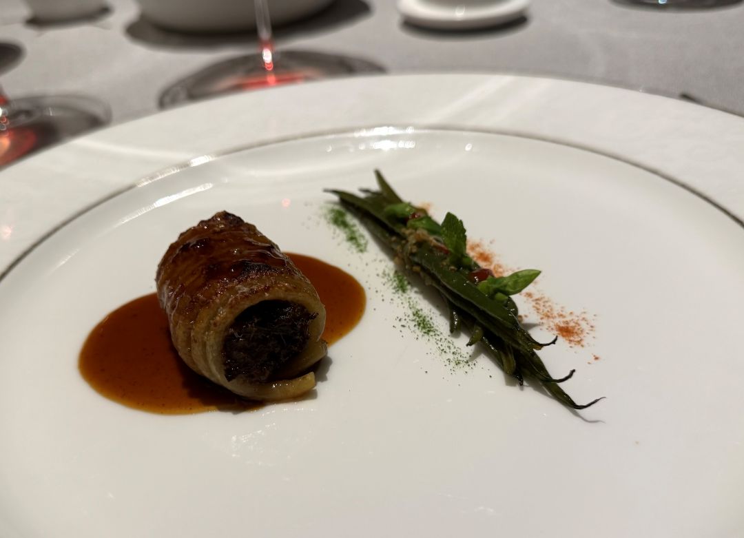 The Turbot is one of the most complex presentations of the evening. Turbot is lacquered with seaweed butter and topped with shellfish and a morsel of grilled tripe. Accompaniments are a snow pea millefeuille, buttermilk and arugula oil. A piece of breaded, lightly fried cheek is served on the side. I suppose the Pasta Cylinder is technically the “main course,” but we are in Italy, so it’s back to pasta. I am not complaining. This dish consists of a cylinder of cooked pasta (my guess is bucatini or something similar) filled with Carne alla Genovese, a rich preparation that sits between a braise and a true sauce. Marinated and grilled string beans are a perfect accompaniment, as they add freshness and acidity to play off the richness of the pasta.